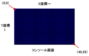 コンソール画面の大きさは50×30文字です。文字を表示する場所は「X座標」と「Y座標」で指定することができます。一番左上の座標が「0,0」で、一番右下の座標が「49,29」となります。