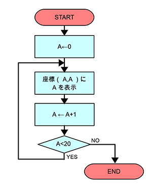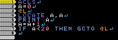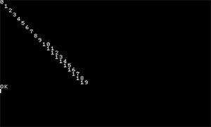 画面に0~19の数値が表示されました。数値がななめに並んでいますが、これはLOCATE命令が正しく機能しているためです。