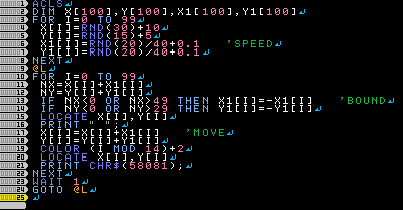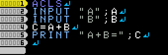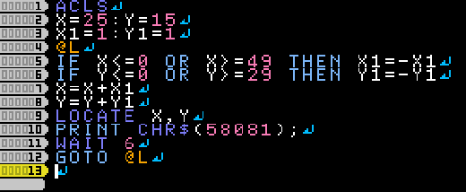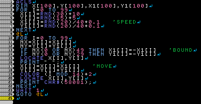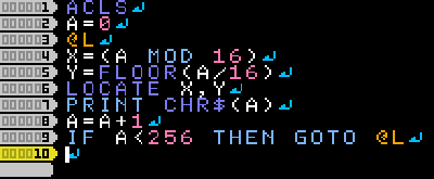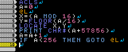 LOCATE命令を使ったプログラムを作ってみました。4行目にはLOCATE命令があります。座標は(A,A)としました。