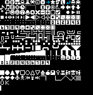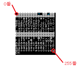プログラムを実行した結果がこちらです。画面に16×16文字=256個の文字が表示されました。