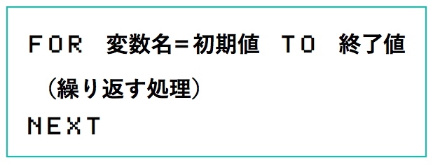 今回、初めて「FOR」という文が使われています。FOR文は一定回数の処理を繰り返すプログラムの処理です。