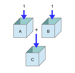 変数Aと変数Bには1が代入され、AとBを足した結果が変数Cに代入されます。