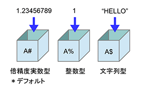 変数名の語尾に記号を付けることで変数の型を指定することができます。語尾に記号が付いていない場合には、デフォルトで実数型が選択されます。