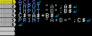 │プログラムの実行結果、その2です。ここでは、A$に「HELLO」を代入して、B$に「WORLD」を代入しました。その結果、「HELLOWORLD」と表示されました。文字列の足し算が正常に行われています。