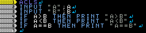ここでは「A<B」という比較を行っています。SmileBASICでは比較した結果が真の場合、その内容が1になるという特性があります。たとえば「PRINT 1<2」を実行すると「1」と表示されます。「PRINT 1>2」を実行すると「0」と表示されます。