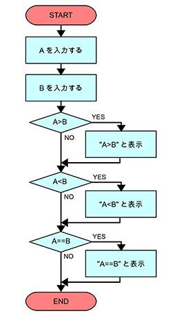 結果、「A<B」と表示されました。変数の値を比較する処理が正常に機能しています。