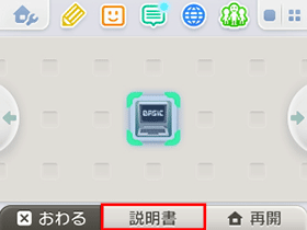 SmileBASICを実行している状態で、本体のHOMEボタンを押します。画面にメニューが表示されますので、「説明書」をタッチします。