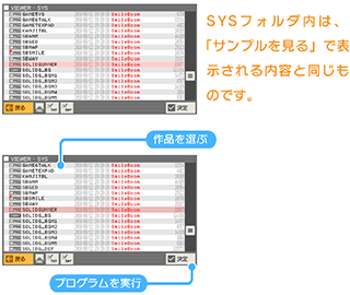 サンプルとして用意されたプログラムやゲームを見る機能です。ファイルを選んで「決定」ボタンを押すとSmileBASICが起動してプログラムが実行されます。詳しくは「サンプルプログラムについて」のページを参照してください。