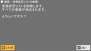 受信拒否リストをクリアします。今まで登録されていた人からの通信を受けられるようになります。受信拒否リストは必ずすべてのリストをまとめて消去します。個別の削除には対応していません。