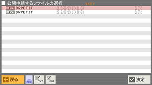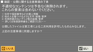 - 十字ボタンで公開したいファイルを選択し、Aボタンで決定します。あらためて、公開に関する注意事項が表示されます。公開申請を行う場合は「はい」をタッチします。