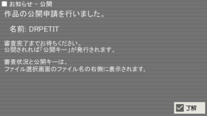 - ここから審査が始まります。プチコンサーバー側でファイル内容を分析し問題が無いことが確認でき次第、公開キーが発行されます。承認までには少し時間がかかります。