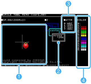 BGやSPRITEのキャラデータを作成するツールです。色見本や編集ツールを選択して、EDITエリアに描きこみます。Yボタンを押してファイルモードに入り、Aボタンを押してファイル名を入力し、決定ボタンを押すと読み込みを行います。Xボタンを入力してファイル名を入力し、決定ボタンを押すと保存します。保存したデータはプログラムから利用可能です。
