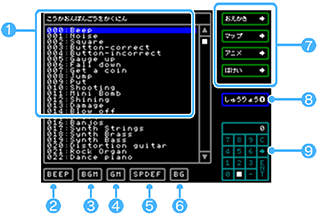 | 1 | あらかじめ登録されているSPRITEのキャラ定義番号と、その画像を確認することができます。Lスティックを上下に動かして他のキャラを確認します。 |