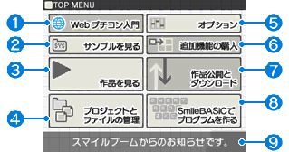 TOP MENU(トップメニュー)は、プチコン3号を起動すると最初に表示される画面です。
