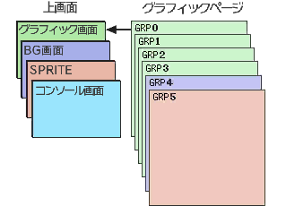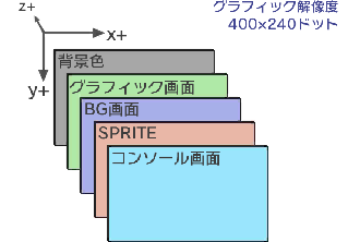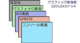 画面最奥から、背景、グラフィック画面、BG画面、SPRITE画面、コンソール画面の5面で構成されています。