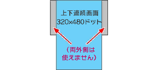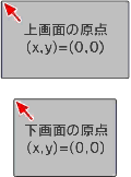 上画面と下画面は、横幅の中央同士が揃うように上下に並びます。座標原点(0,0)はそれぞれ左上となります。