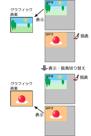 初期状態では、描画ページと表示ページは同じGRP0(下画面ではGRP1)ですが、GPAGE命令により、変更可能です。