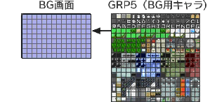 BGキャラは、グラフィックページのGRP5にあらかじめ読み込まれています。1つのキャラは16×16ドットで、0~1023までのキャラ番号が付いています。