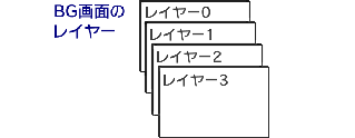 BG画面は、4枚のレイヤーが重なった構造になっており、それぞれにBGキャラを配置できます。遠景と近景を作り分けたり、多重スクロールさせたりという使い方ができます。