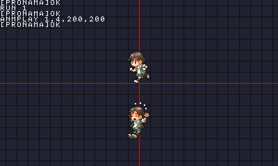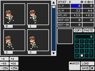 ※SMILE TOOL Ver.1.02(『プチコン3号』Ver.3.1.0までに付属)が出力するプログラムでは、ユーザー関数ANMPLAYは常に管理番号0番を選ぶため、同時に2つのスプライトを表示できません。これを修正するには、プログラム最終行ENDの1行上にあるSPOFS SPTOP,HX,HYを、SPOFS SP,HX,HYに変更して実行します。