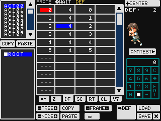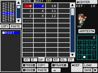 ファイルを読み込んだら、Bボタンでファイル管理メニューを終了します。ここでたとえば表の中の「DF」を選ぶと、読み込まれたデータが並んでいるのが見えるでしょう。左上の「ACT~」を切り替えれば、アニメが切り替わります。