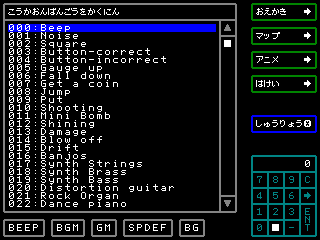 LOAD"PRONAMA"↵でサンプルプログラムを読み込みます。RUN↵するとサンプルが実行されます。このサンプルでは、画像データを読み込み、キャラクター単位のアニメにして、ランダムに表示しています。