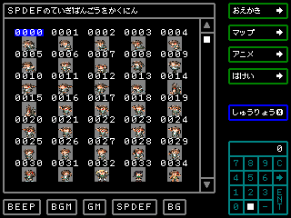 右下の「SPDEF」ボタンでモードを変更したり、本体Xボタンでツールを終了してSMILE TOOLトップの下メニューから「SPDEF」ボタンで、SPRITEの定義状態が一覧できます。元画像から全部のデータが切り分けられて配置されていることがわかるでしょう。