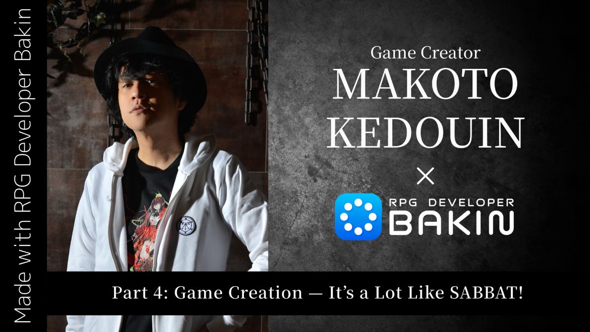 KEDOUIN, the creator behind the popular horror game Corpse Party, is currently developing a new sample game using Bakin. The journey is documented in the fourth blog installment of "Made with RPG Developer Bakin", titled “Game Creation — It’s a Lot Like SABBAT!” which is now available.
