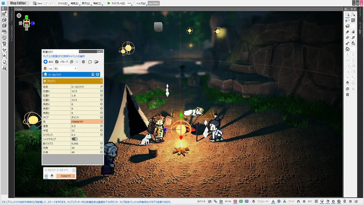 スイッチをオンにするだけで、マップ上に配置したライトに応じた影を自動生成できる「シャドウマップ」を実装しました。焚火や懐中電灯による影など、光と影を活かした臨場感のある演出を手軽にゲーム内へ取り入れることができます。