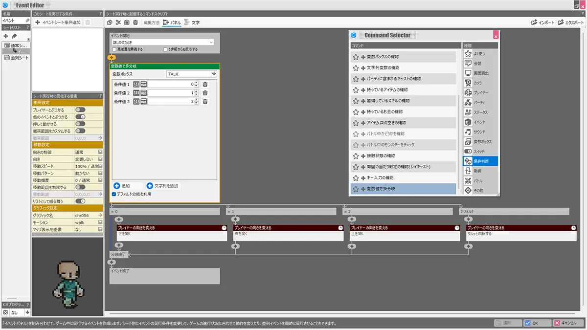 変数の値に応じて複数の分岐を作成できる「変数値で多分岐」パネルを追加しました。いわゆるSwitch文のような処理が可能で、数値だけでなく文字列での分岐にも対応しています。従来は複数のイベントパネルを組み合わせる必要があった条件分岐を、よりシンプルに構築できるようになります。